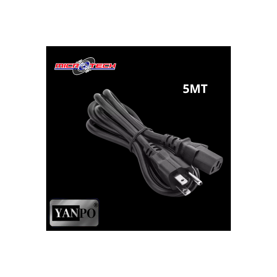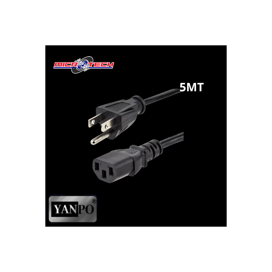 es un cable de poder tripolar de 5 metros de longitud, diseñado para conexiones seguras y confiables de dispositivos eléctricos de alto rendimiento, ideal para computadoras y equipos electrónicos.